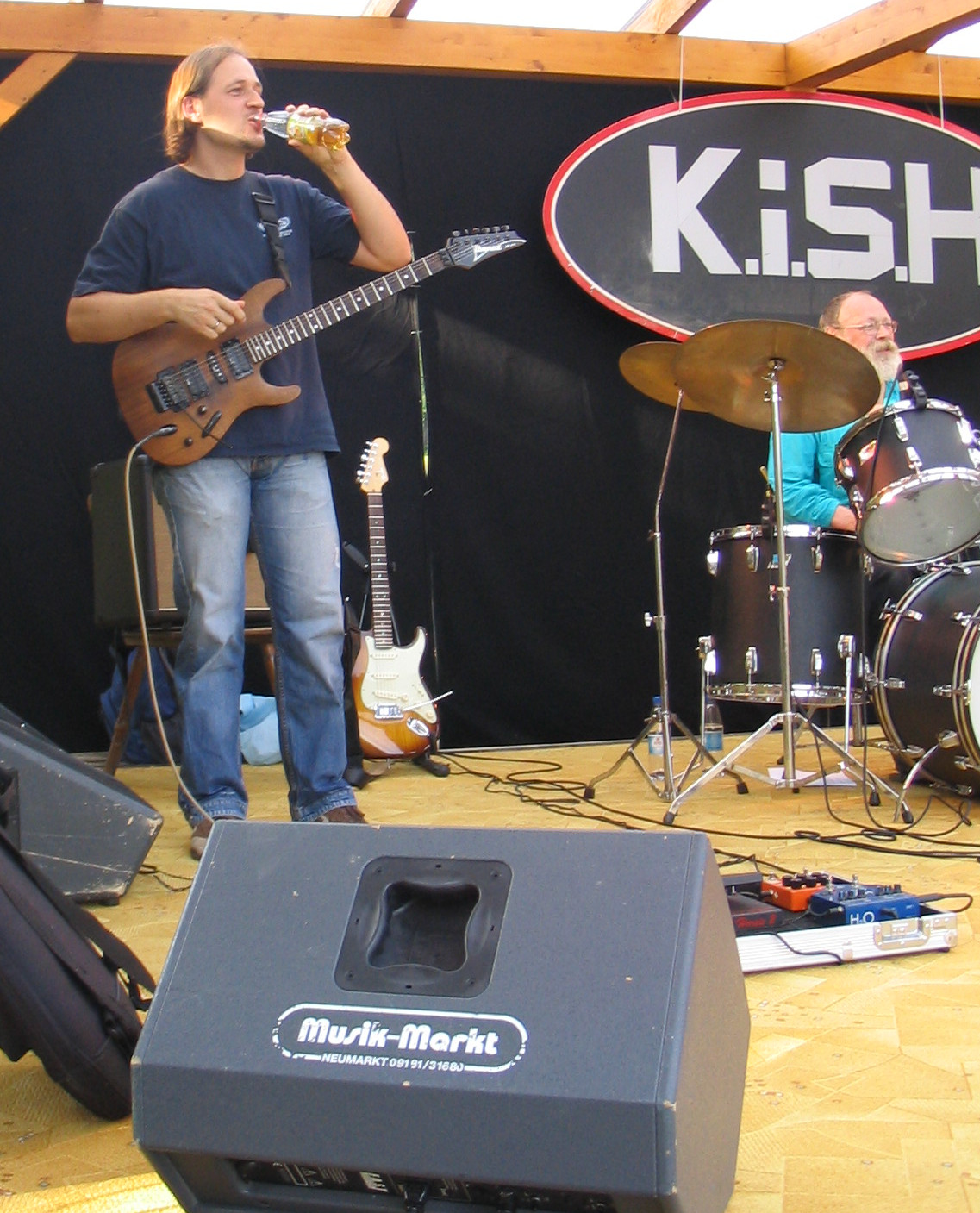 Bandmässig fanden die ersten Gehversuche erst zuhause im Keller mit besagten Brüdern (die sich statt Akkordeons nun u.a. Bass und Schlagzeug besorgt hatten) und eigenen Song-Ideen, später dann an der Uni statt - hier wurde gecovert was das Zeug hielt, von den "Four Non Blondes" über Toto bis hin zu Gary Moore. Nach der Uni ging es dann steil ins Berufsleben und die Gitarre hing erst einmal ein paar Jahre am berühmten Nagel, bis ich mir eines Tages 2004 zufällig am Bahnhofskiosk nach Jahren mal wieder die "Soundcheck" kaufte (weil 'ne DVD dabei war...) - und da hörte ich den für mich geilsten Stratsound seit Jahren, nämlich in einem Video von Thomas Blug("I'll be there", von seiner Live-DVD "Live In Raalte, NL", sehr zu empfehlen!). Das hat mich tatsächlich nicht nur zurück zur Gitarre, sondern auch zur Stratocaster gebracht, ein paar Monate später hatte ich meine "American Deluxe 50th Anniversary Strat" und war wieder fleißig am Üben!